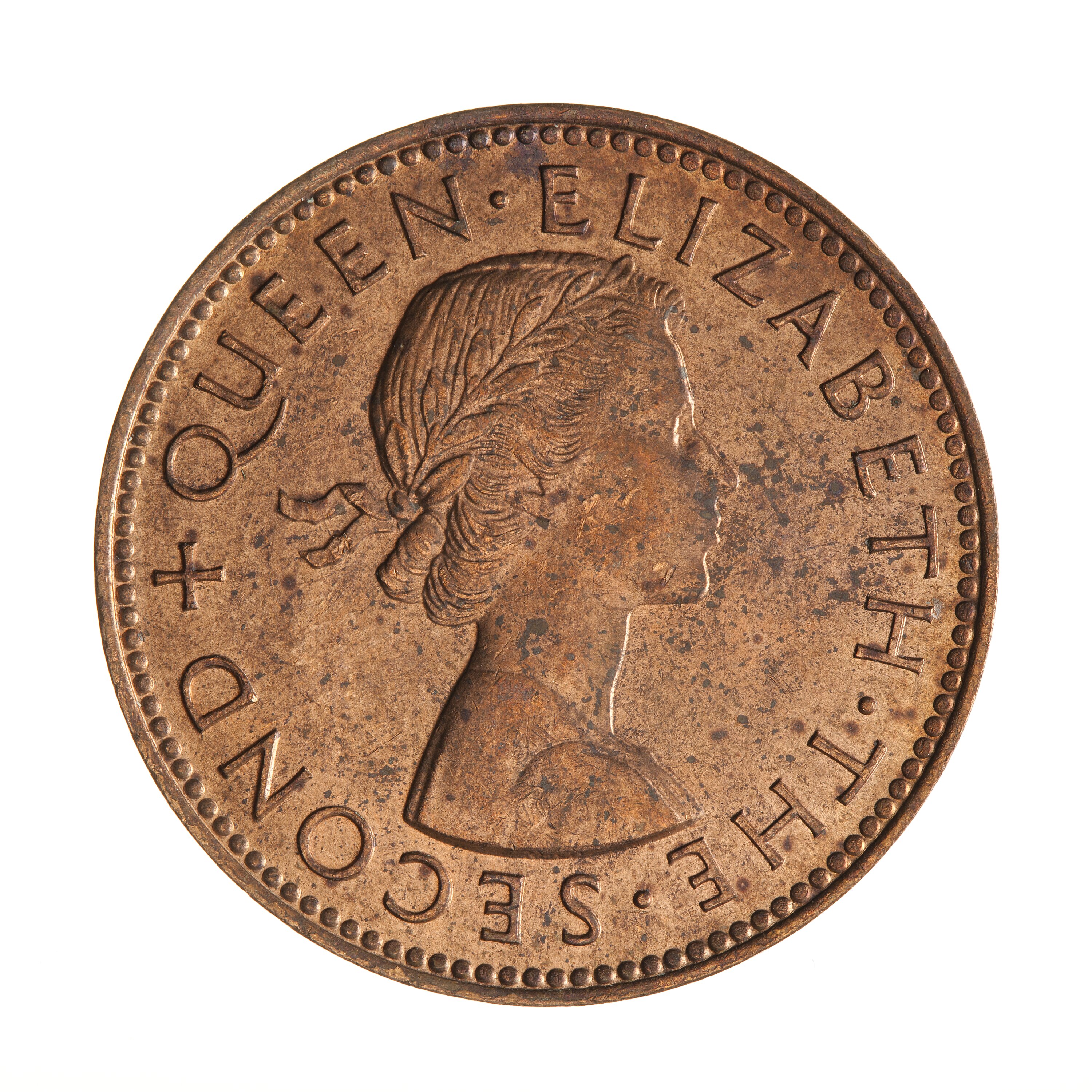 Laureate bust right; around, + QUEEN ELIZABETH THE SECOND; artist's initials incuse on neck truncation, MG (Mary Gillick)