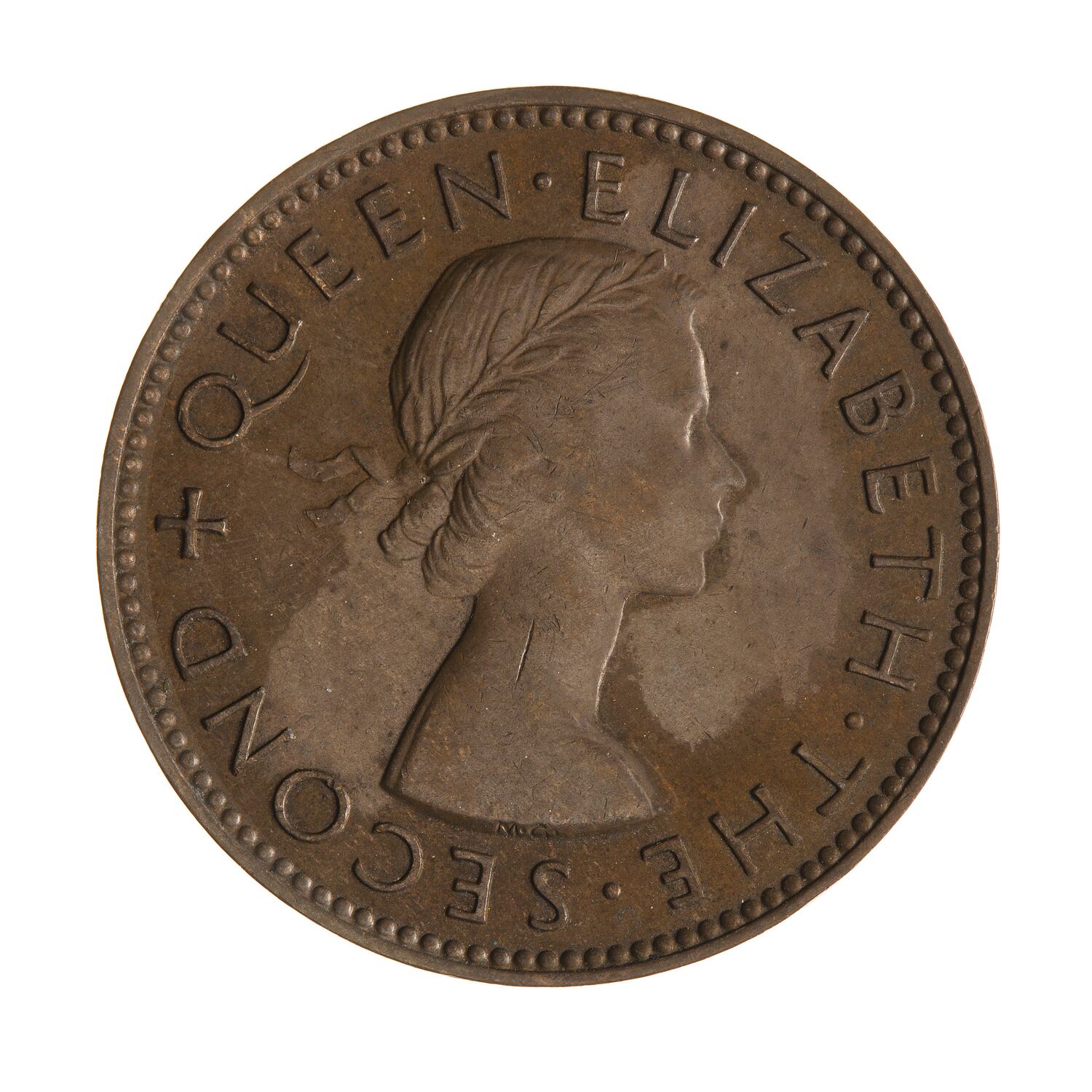 Laureate bust right; around, + QUEEN ELIZABETH THE SECOND; artist's initials incuse on neck truncation, MG (Mary Gillick)