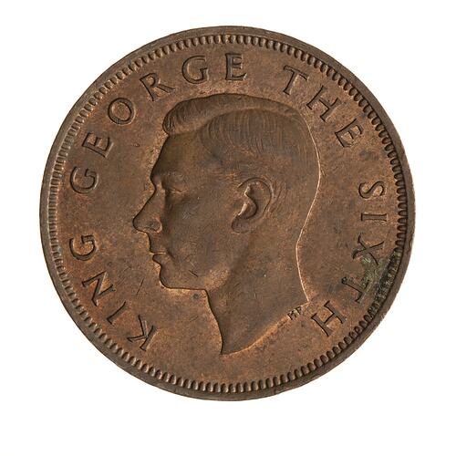 Bare head facing left; around, KING GEORGE THE SIXTH; below neck in small letters the artist's initials, HP (Humphrey Paget)