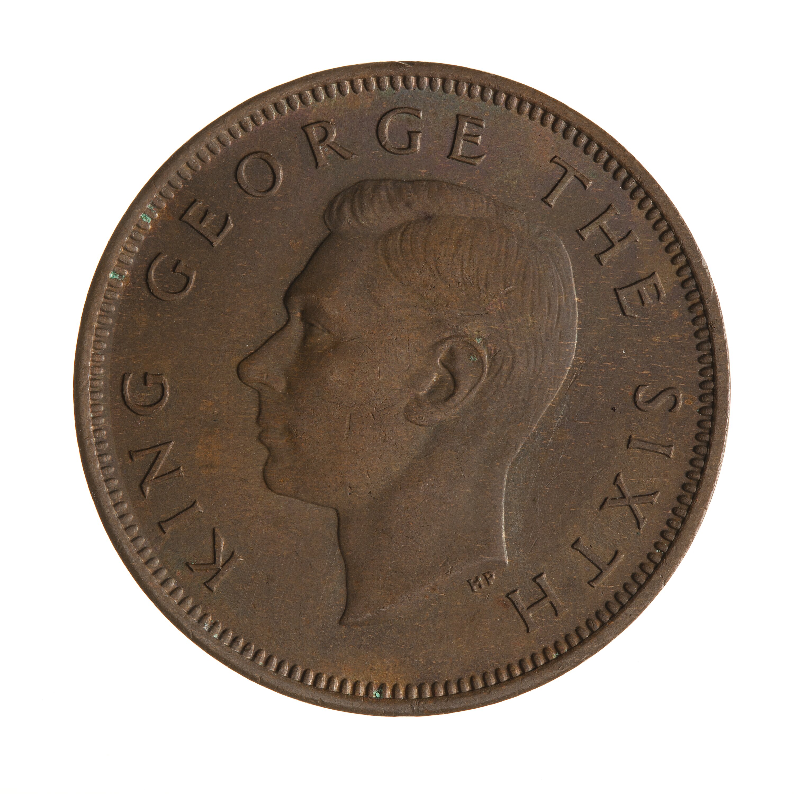 Bare head facing left; around, KING GEORGE THE SIXTH; below neck in small letters the artist's initials, HP (Humphrey Paget)