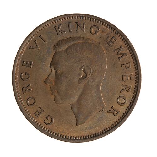 Bare head facing left; around, GEORGE VI KING EMPEROR; below neck in small letters the artist's initials, HP (Humphrey Paget)