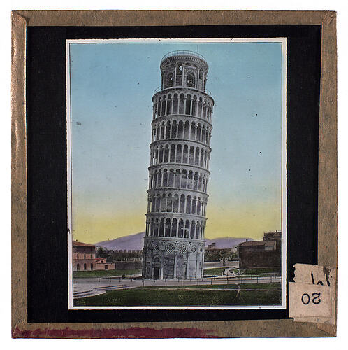 Colour glass lantern slide of photograph of the Leaning Tower of Pisa. Made by Alex. Gunn & Sons, Melbourne, Victoria, circa 1930s.