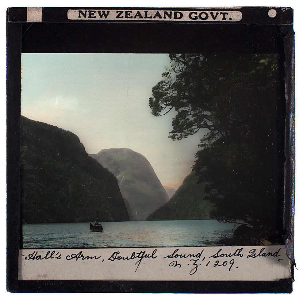 Lantern slide of Hall's Arm, Doubtful Sound, New Zealand.