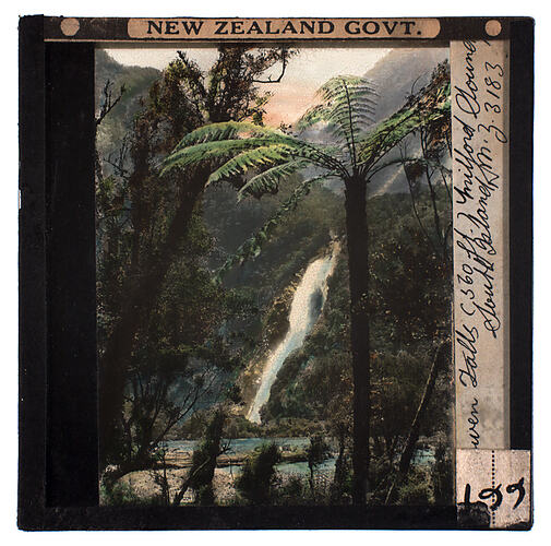 Text, on slide: NEW ZEALAND GOVT. Text on attached label:Bowen Falls (360 ft.), Milford Sound, South Island, N.Z. 3183' Text on attached label: '661'.