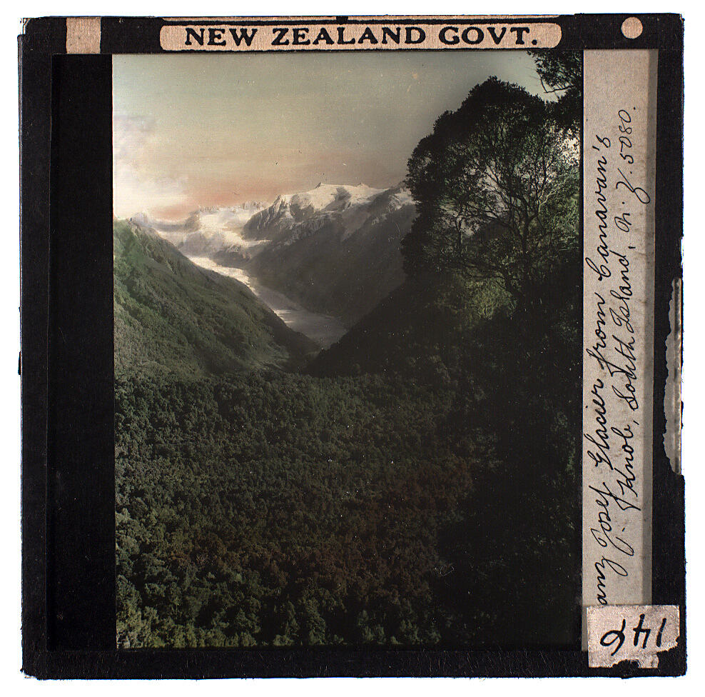 Lantern slide of Franz Josef Glacier, South Island, New Zealand.