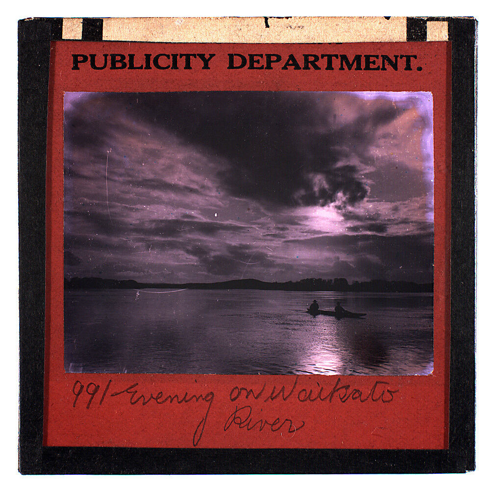Text, on slide: PUBLICITY DEPARTMENT. Handwritten text: '991. Evening on Waikato River'.