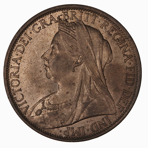 The Veiled head obverse was introduced on the gold and silver issues to commemorate the Diamond Jubilee of Queen Victoria in 1893. It was introduced on the bronze Denominations in 1895.