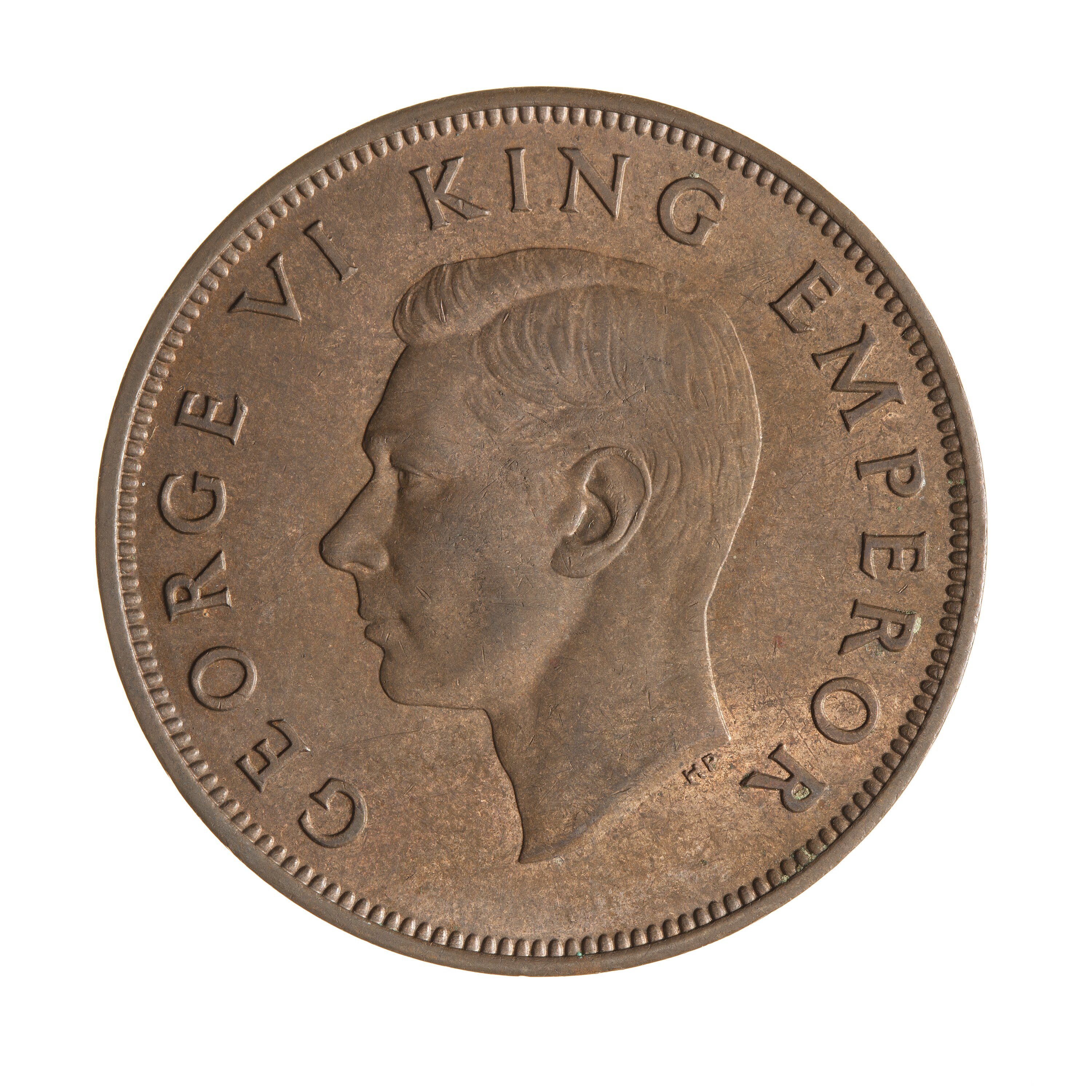 Bare head facing left; around, GEORGE VI KING EMPEROR; below neck in small letters the artist's initials, HP (Humphrey Paget)