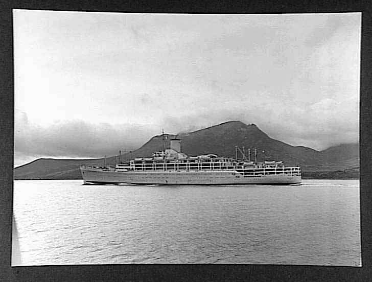 Port side profile view from astern of the newly-completed Orient Line passenger liner RMS Orcades, during official speed trials in the Firth of Forth, Scotland with Isle of Arran in the background, November 1948.