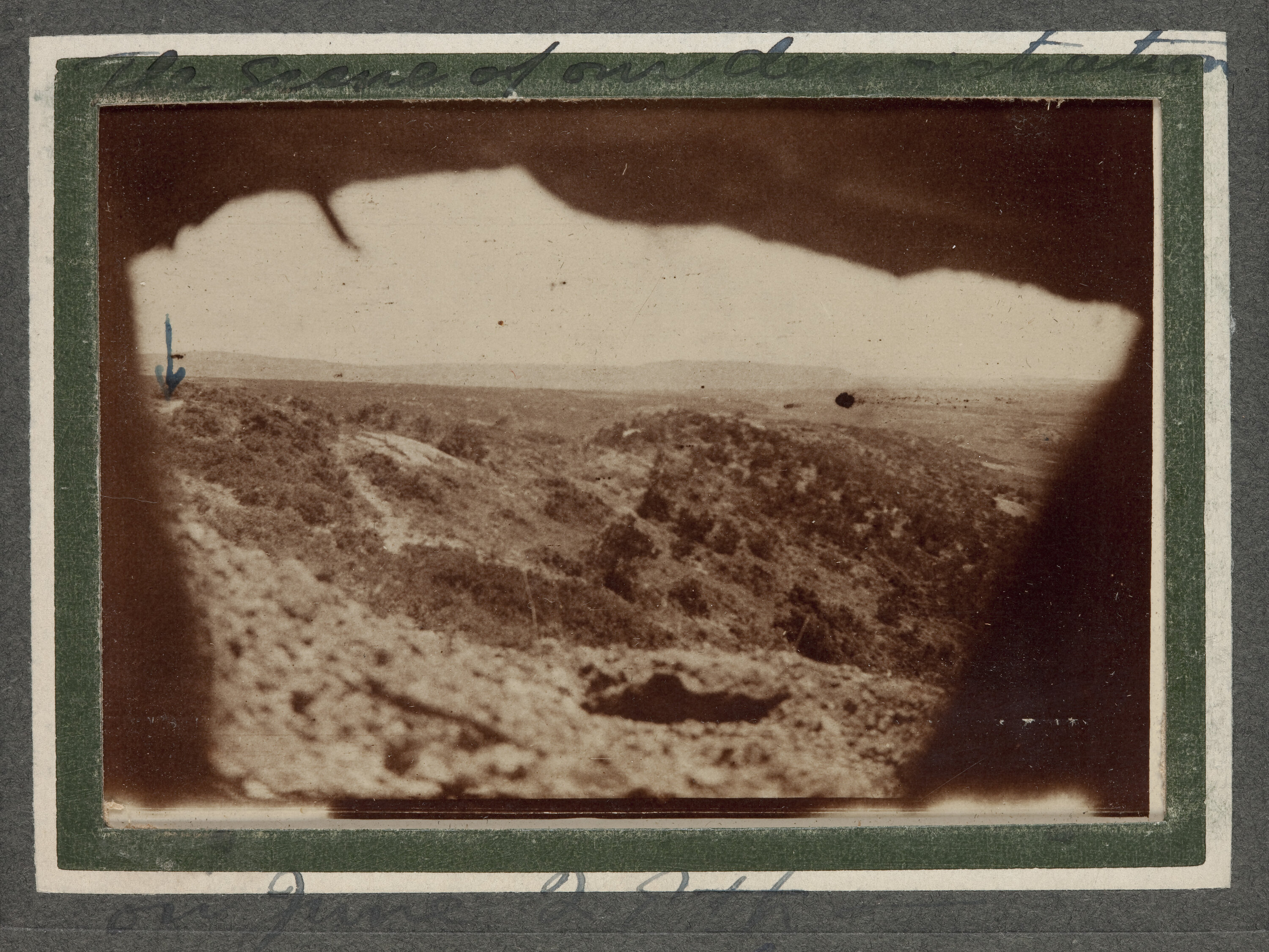 Hand written on secondary support above image: 'The scene of our devestation' Hand written on secondary support below image: 'on June 2th\Dead Aust & rifle in\No Mans Land' Bottom right corner of album page, handwritten in pencil: '24'