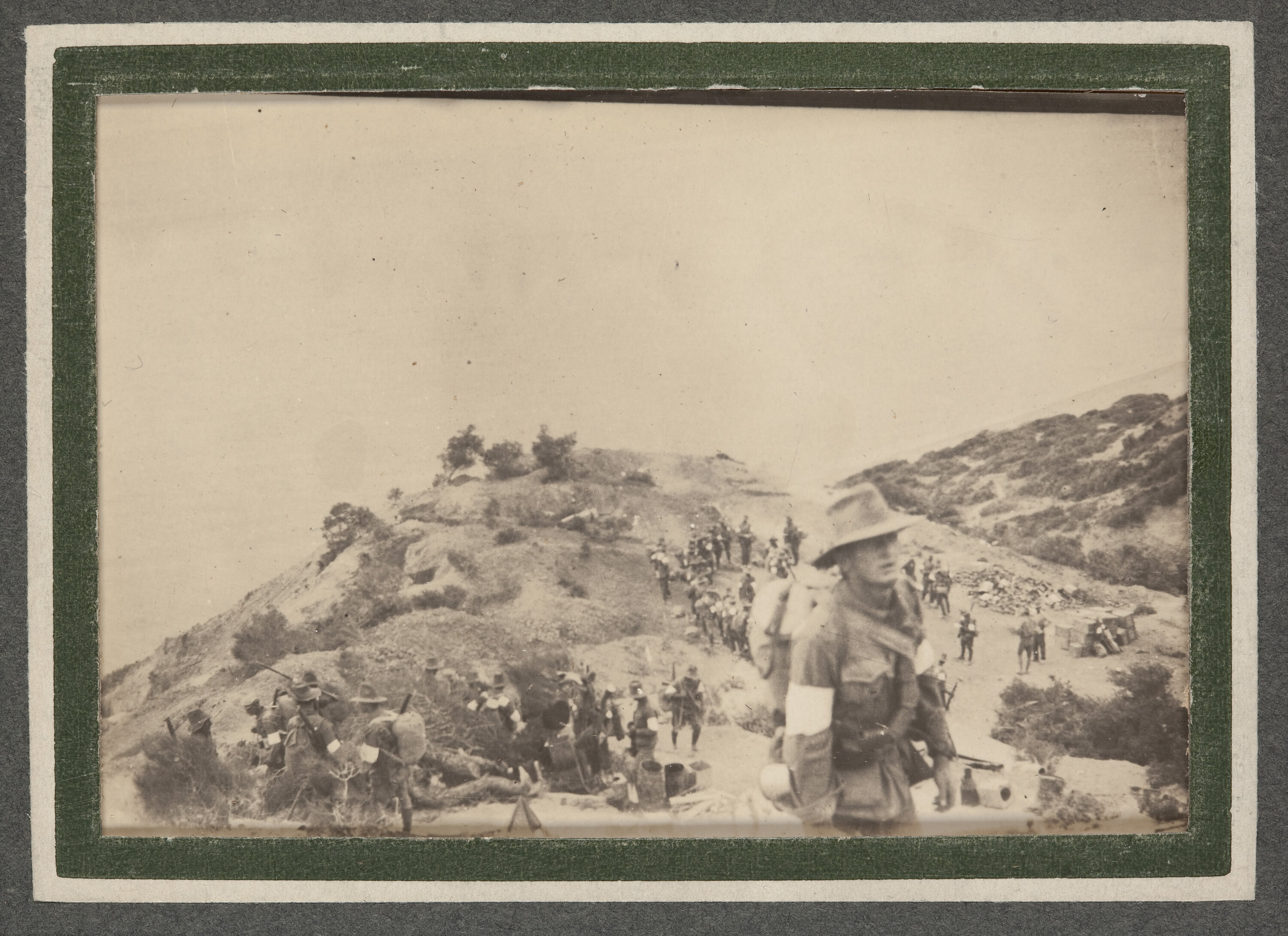 Photograph in an album that belonged to an Australian serviceman in the 5th Australian Light House during World War I. The album contains 103 small black and white photographs, mainly of Gallipoli in 1915 and some of France and Belgium. They are believed to have been taken by Trooper George Simpson Millar, service no. 160, 'A' Troop, 'C' Squadron, 5th Australian Light Horse Regiment, 2nd Australian Light Horse Brigade, A.I.F. He served in Gallipoli and France (for some time as an officer in the Imperial Army), returning to Australia in 1919.