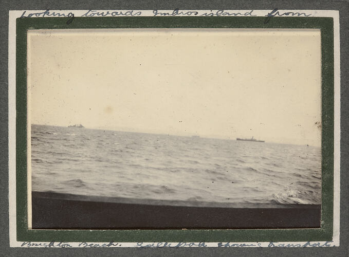 Hand written on secondary support above image: 'Looking towards Lemnos Island from' Hand written on secondary support below image: 'Brighton Beach Gallipoli ships' transport' Bottom right corner of album page, handwritten in pencil: '8'