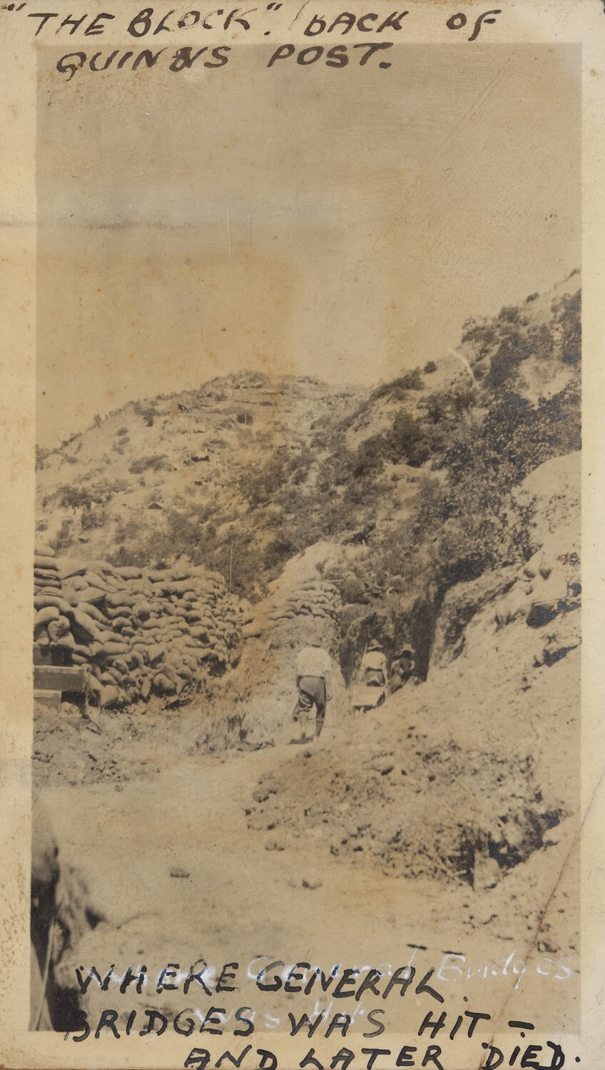 The photograph was taken in Gallipoli during George Simpson Millar's time on the peninsula (May-August 1915). Quinns Post was one of the most dangerous areas at Gallipoli until the ANZACs established control over the area in June 1915. Bridges was the commander of the 1st Australian Division at Gallipoli and was shot by an sniper and later died of wounds.