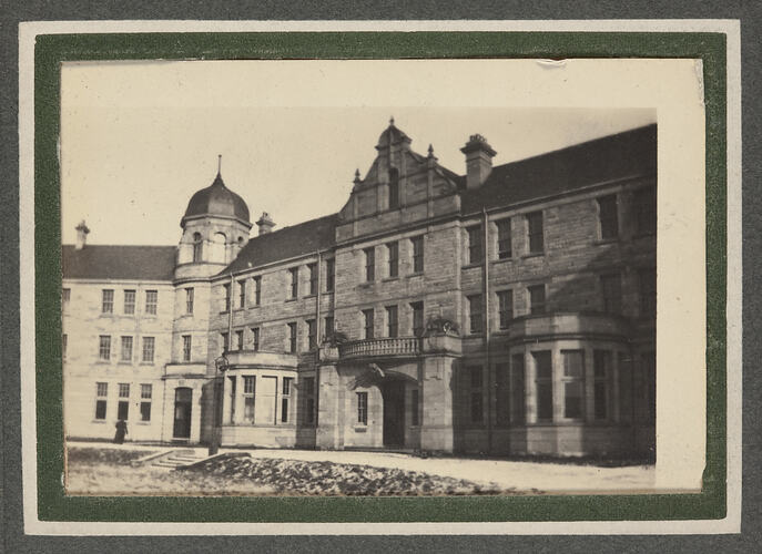 The building in the photo is unidentified. One possible candidate is the Hanover House, Regents Park, that is mentioned as his C/O address while he was between AIF and his commission in the British Army. Another plausible candidate is Redford Barracks in Edinburgh, Scotland, where he served as an officer in the Royal Artillery.