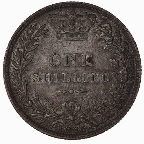 Within an open wreath of laurel and oak leaves below a crown, ONE / SHILLING; below, 1885