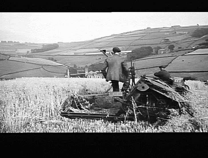 A tractor-drawn 6b reaper/binder at work in a one acre field in England.