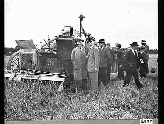 A Sunshine 12 ft 'K' type auto-header being demonstrated in England. Mr Lindsay Baglin from the Sunshine factory is shown at the left front of the header with (possibly) members of the Ministry attending.