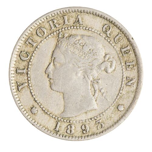 Within a beaded circle, a diademed head of the Queen facing left; around, VICTORIA QUEEN; below between two roses, 1893
