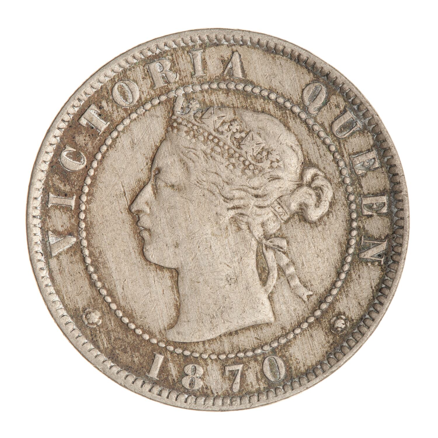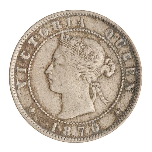 Within a beaded circle, a diademed head of the Queen facing left; around, VICTORIA QUEEN; below between two roses, 1870