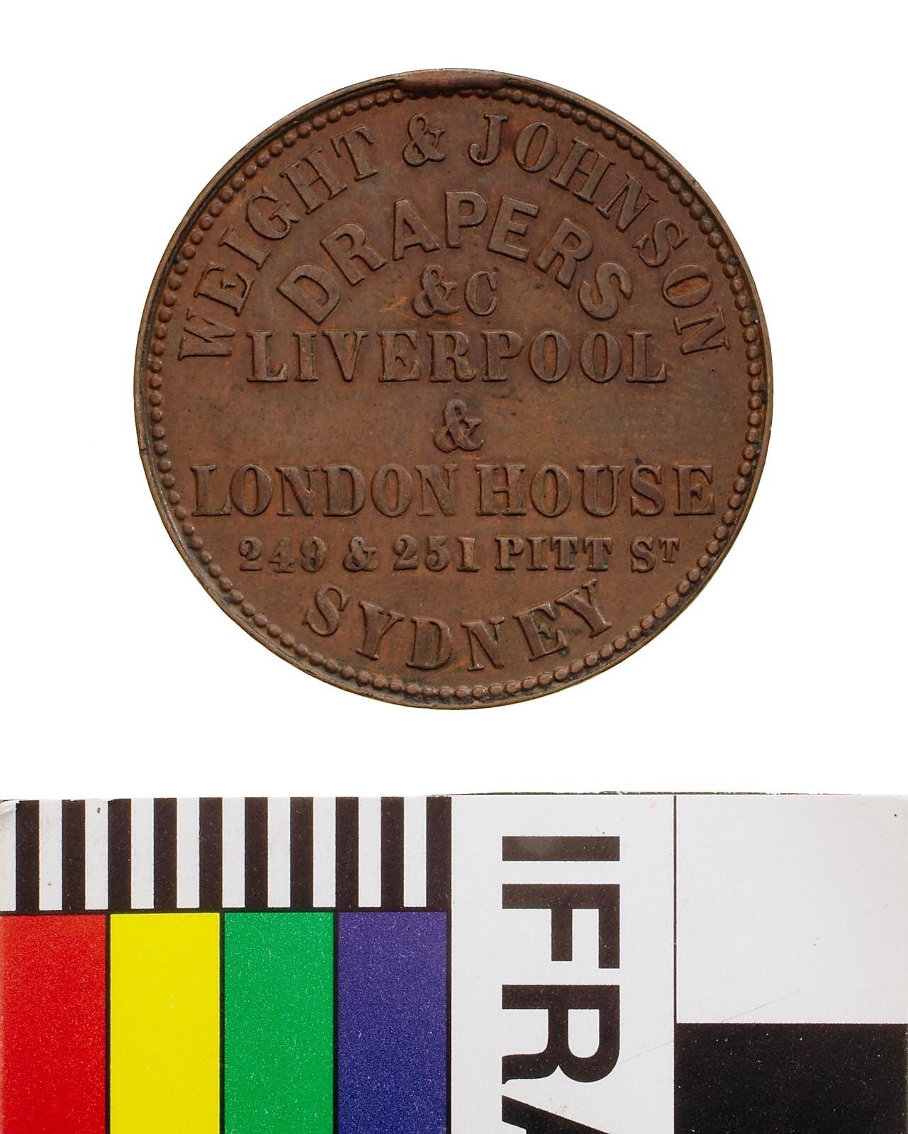 Copper Halfpenny Token, minted by Heaton & Son, Birmingham. Issued by Weight & Johnson, Drapers & Outfitters, Sydney, circa 1857. J.W. Weight & James Johnson, drapers, are listed in two Sydney Directories (Sand's Directories for 1857-1858 and 1861-1862). Over the period 1851-1870, John Weight was the only draper of that surname listed in Sydney directories, other than this four-year interlude where J.W. Weight is listed as a principal of Weight & Johnston.