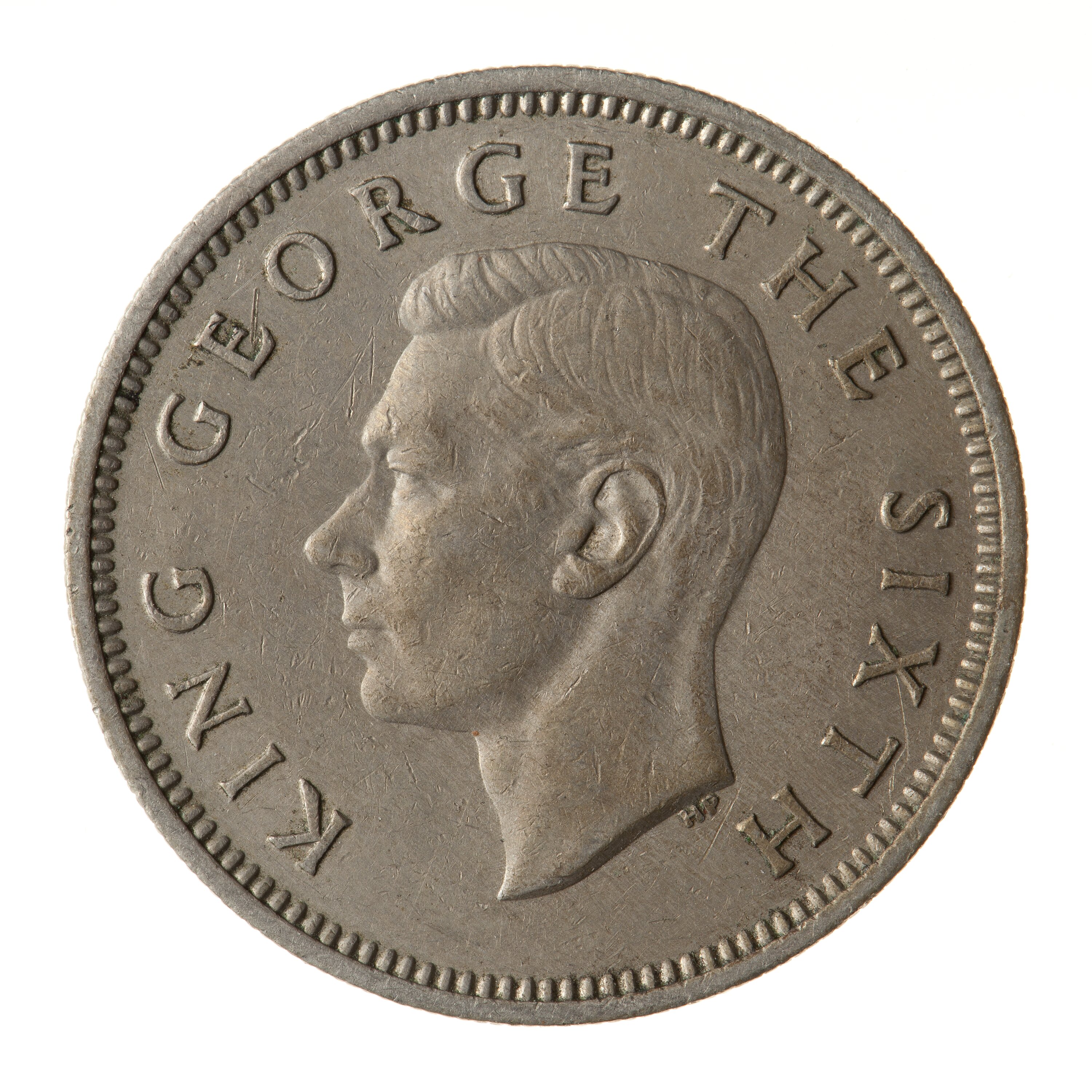 King's head, bare, facing left; around, KING GEORGE THE SIXTH; below neck truncation in small letters the artist's initials HP ([Thomas] Humphrey Paget)