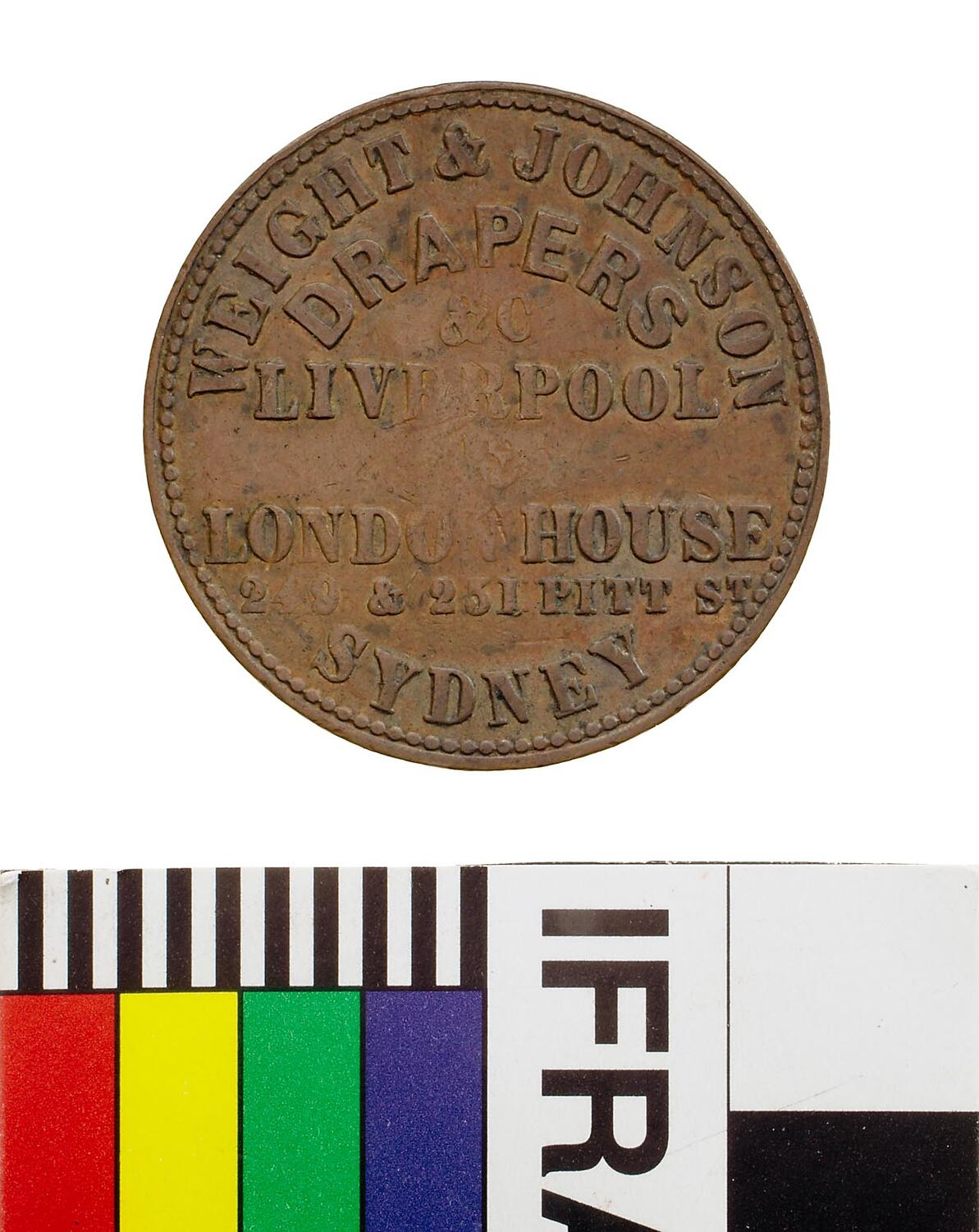 A round copper token (28 mm diameter). The token design featuring the name, business and address of the issuer: Weight & Johnson, drapers and outfitters, Liverpool and London House, Pitt St. Sydney. It features a representation of Justice standing blindfolded holding scales and an inverted cornucopiae spilling fruit on the ground. A sailing ship is on the horizon.