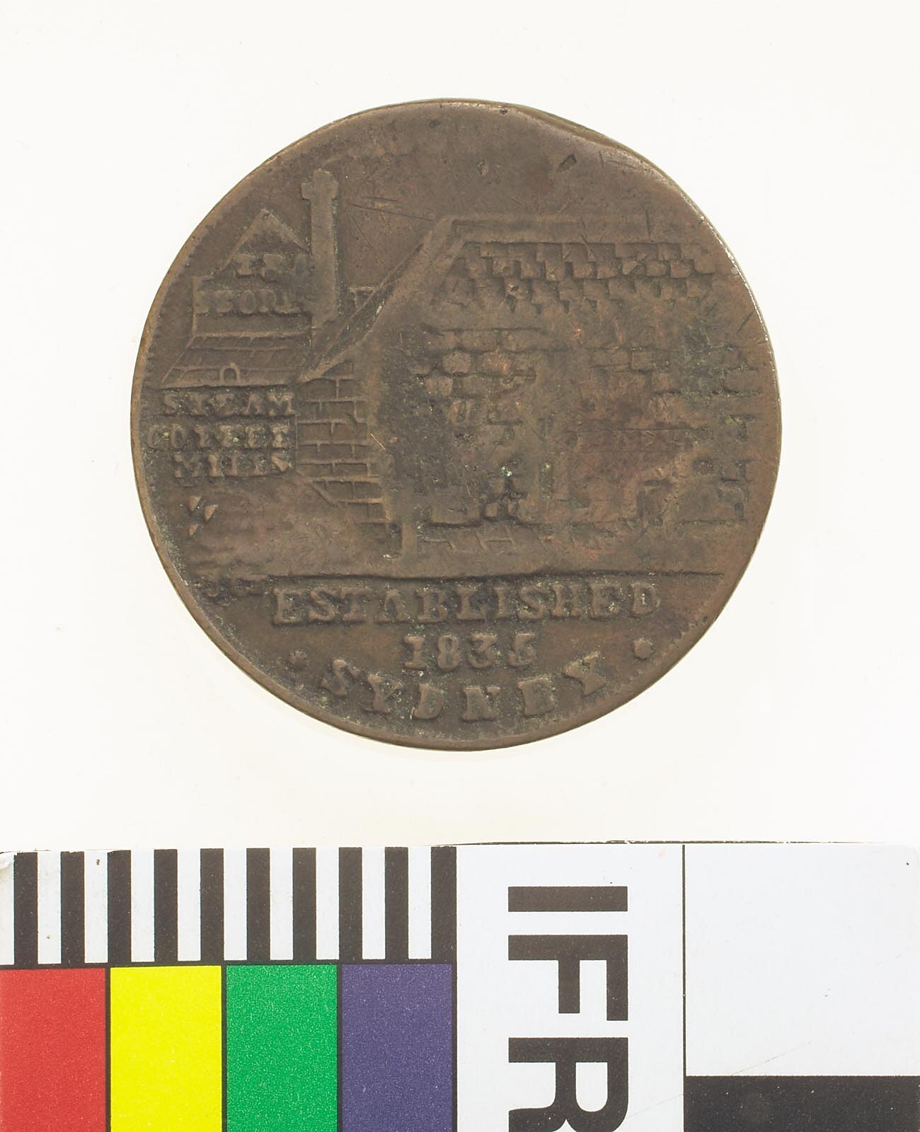 A round copper token (29 mm diameter). The token design featuring the business and foundation date of the issuer: Tea Stores Steam Coffee Mill. It features a view of teas store and shop; on building at left background in five lines; TEA / STORE / STEAM / COFFEE / MILLS in exergue, ESTABLISHED / 1835 / SYDNEY. On the reverse is Britannia seated facing right wearing Corinthian helmet and holding a trident in her left hand, shield with Union Jack resting behind. Above, BRITANNIA; in exergue, 1852 and, in small letters below shield, JCT.