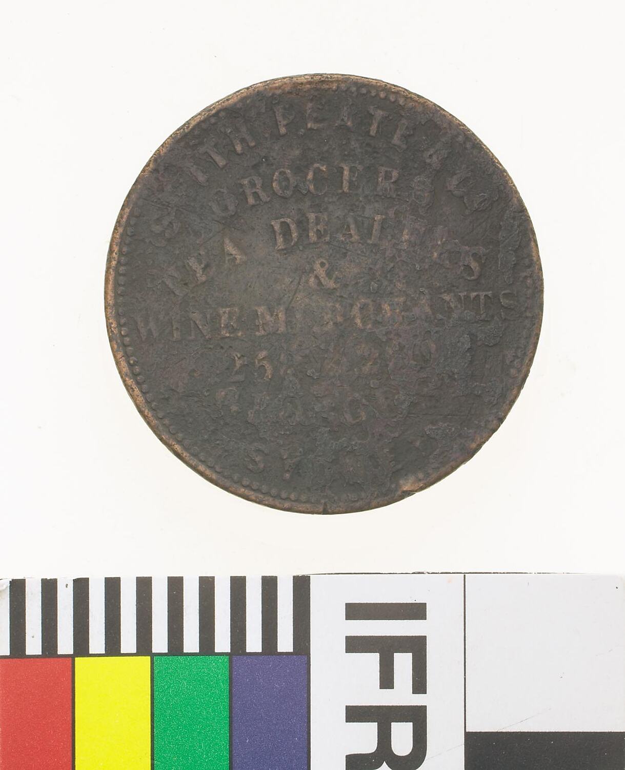 A round copper token (28 mm diameter). The token design featuring the name, address, business and foundation date of the issuer: Smith, Peate and Co., 258 & 260 George Street Sydney, grocers, tea dealers, wine merchants. The reverse depicts Justice standing facing left, blindfolded and extending balanced scales from her right hand, her left hand rests on an inverted cornucopiae from which fruits flow. A sailing ship is seen on the horizon to the left of the figure. This token is badly corroded and dark. This was part of a large issuer of tokens production of which involved four obverse and three reverse dies. The obverse of all dies bore the same legend. This die was characterised by the letters of the words WINE MERCHANTS being 24.9 mm long; 128 dots around the edge and the A of TEA being 2.0 mm from the D of DEALERS. This die had the T of ST. re-entered. The reverse die is characterised by the distance of the start and end of the word ESTABLISHED to the horizon is: E to sea 9.0 mm, D to sea 10.0 mm; border of 113 dots. The scale bar extended would pass through the E and below the D of ESTABLISHED. See notes tab for a table of other die variations.
