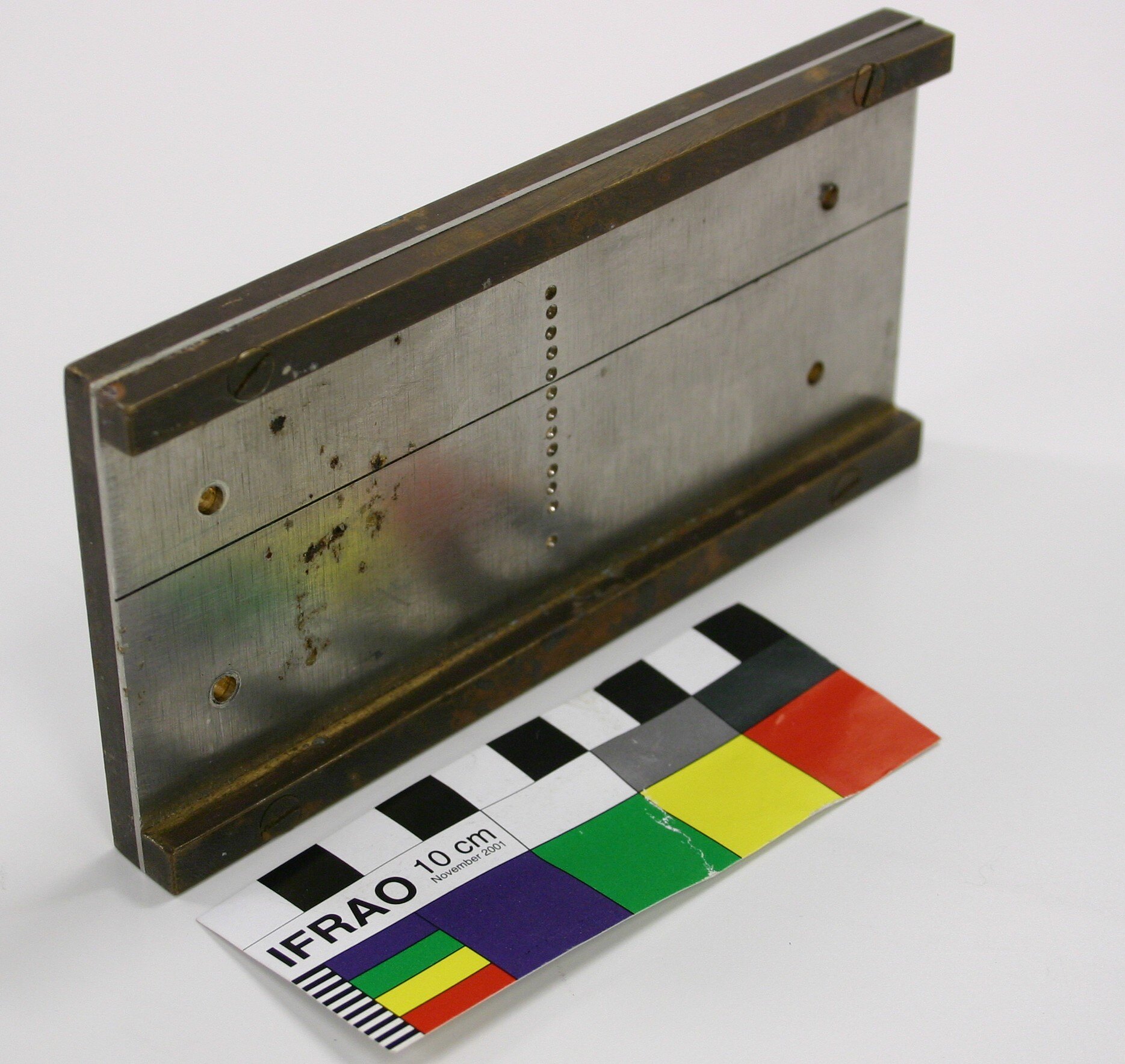 The plate is a prototype made by the workshop at CSIRO Division of Building Research in the late 1950s for staff to use in the program preparation area associated with the computer CSIRAC at the University of Melbourne. A modification of this plate was used as it was probably difficult to locate the paper tape over the holes without a clamp with holes in it.