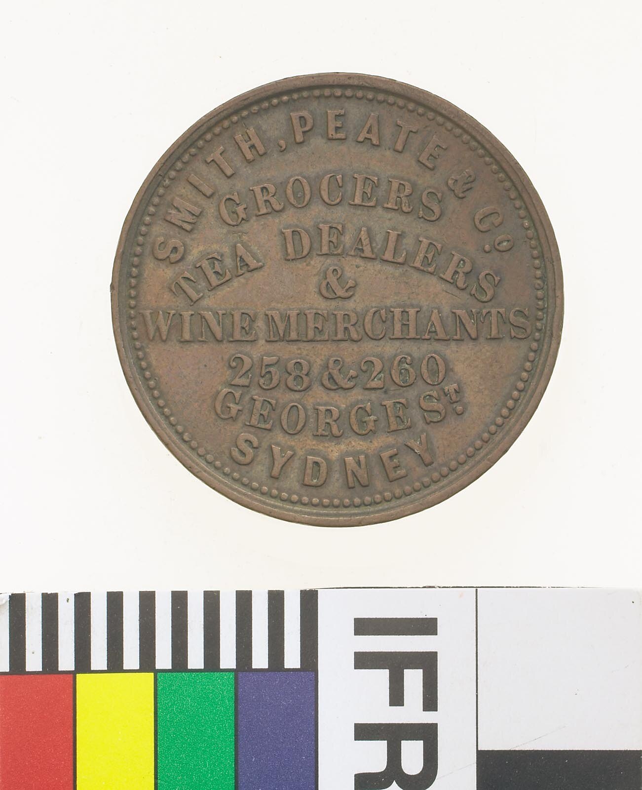 Obverse: SMITH, PEATE & Co. GROCERS TEA DEALERS & WINE MERCHANTS 258 & 260 GEORGE ST. SYDNEY Reverse: ESTABLISHED 1836