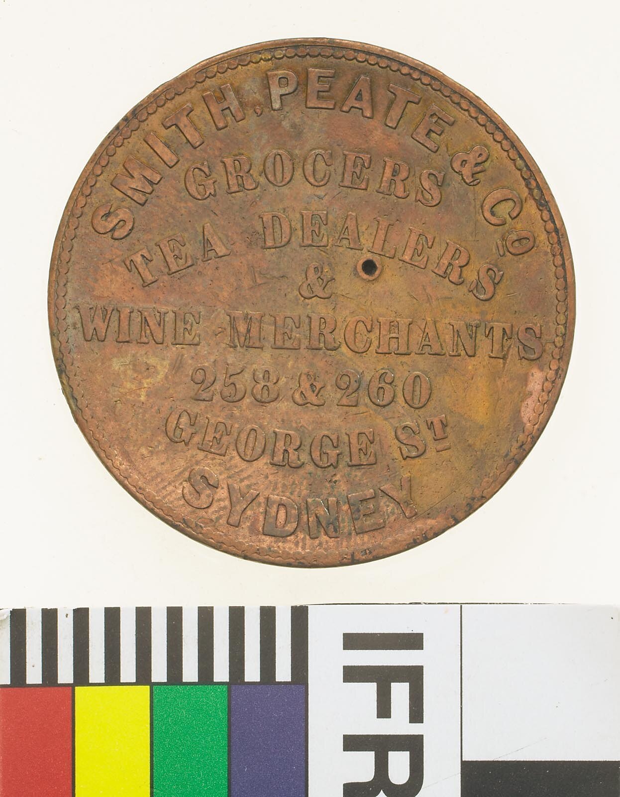 Obverse: SMITH, PEATE & Co. GROCERS TEA DEALERS & WINE MERCHANTS 258 & 260 GEORGE ST. SYDNEY Reverse: ESTABLISHED 1836