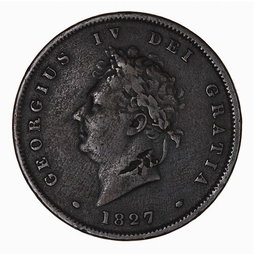 Laureate head of the King facing left; around, GEORGIUS IV DEI GRATIA; below, 1827