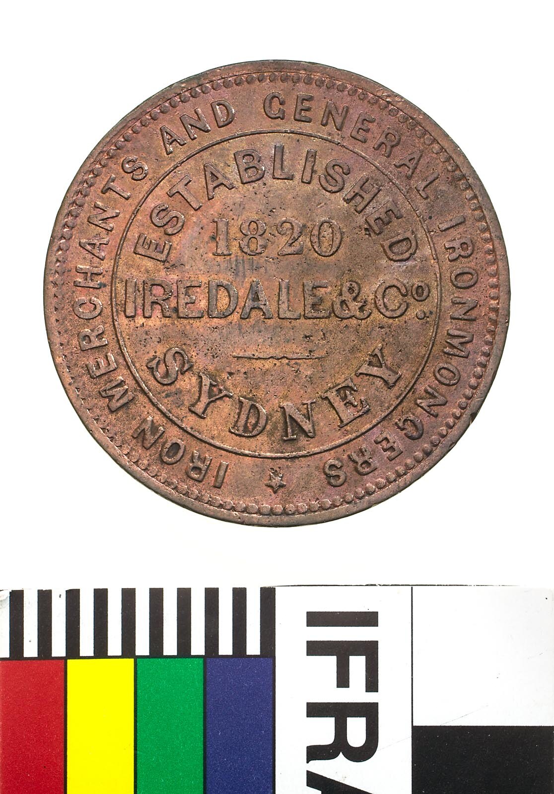 At centre within line circle, ESTABLISHED / 1820 / IREDALE & CO. / SYDNEY around, * IRON MERCHANTS AND GENERAL IRONMONGERS