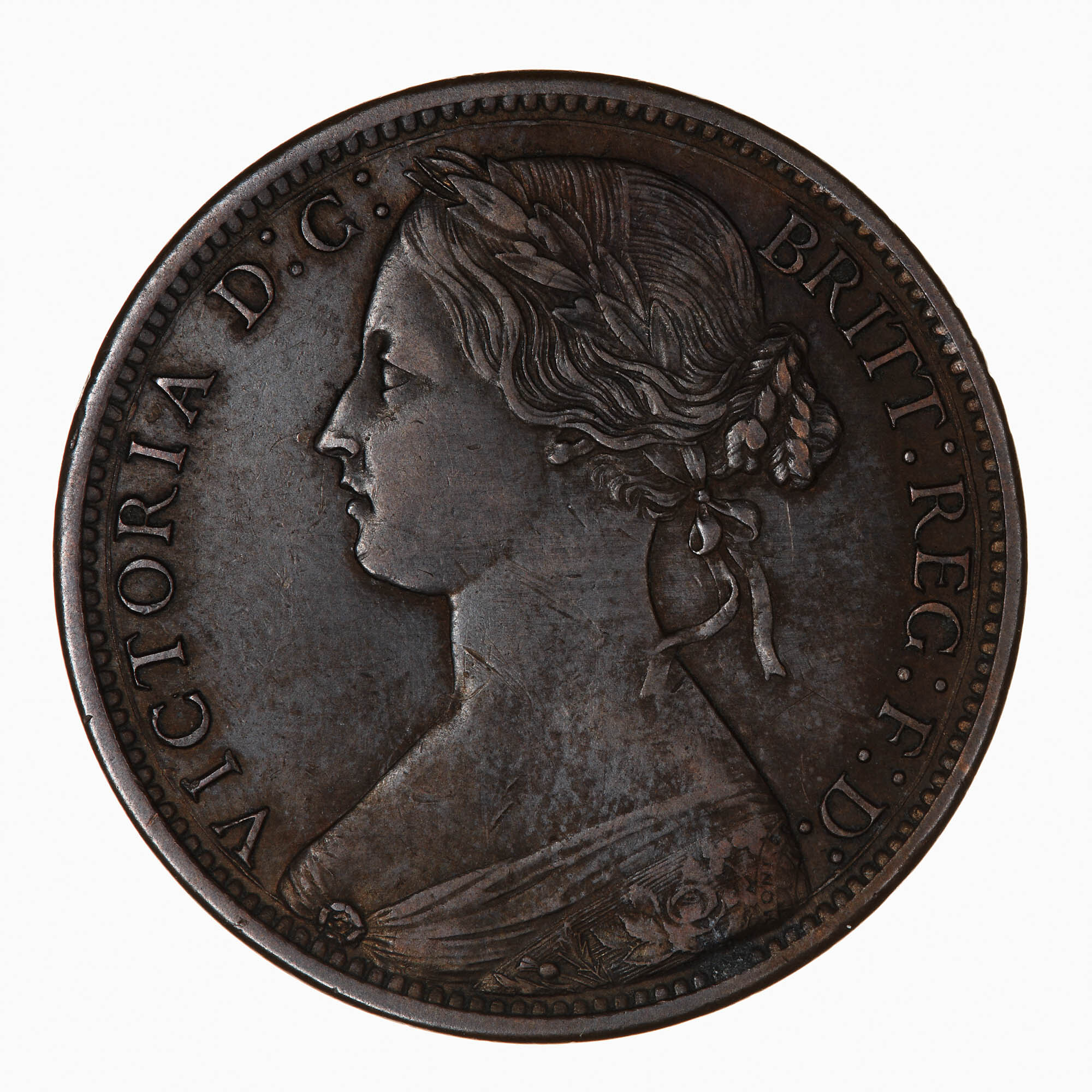 Bust of Queen Victoria facing left wearing bodice and a mantle decorated with rose, thistle and shamrock; in her hair a wreath of leaves and berries tied at back with ribbon, her hair drawn to a plaited bun behind, she wears a circular broach; around, VICTORIA D: G: BRITT: REG: F: D: