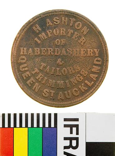 Obverse: H.ASHTON/IMPORTER/OF/HABERDASHERY/&/TAILORS/ TRIMMINGS/QUEEN ST. AUCKLAND Reverse: NEW ZEALAND 1863