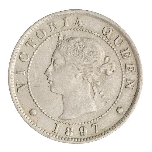 Within a beaded circle, a diademed head of the Queen facing left; around, VICTORIA QUEEN; below between two roses, 1897