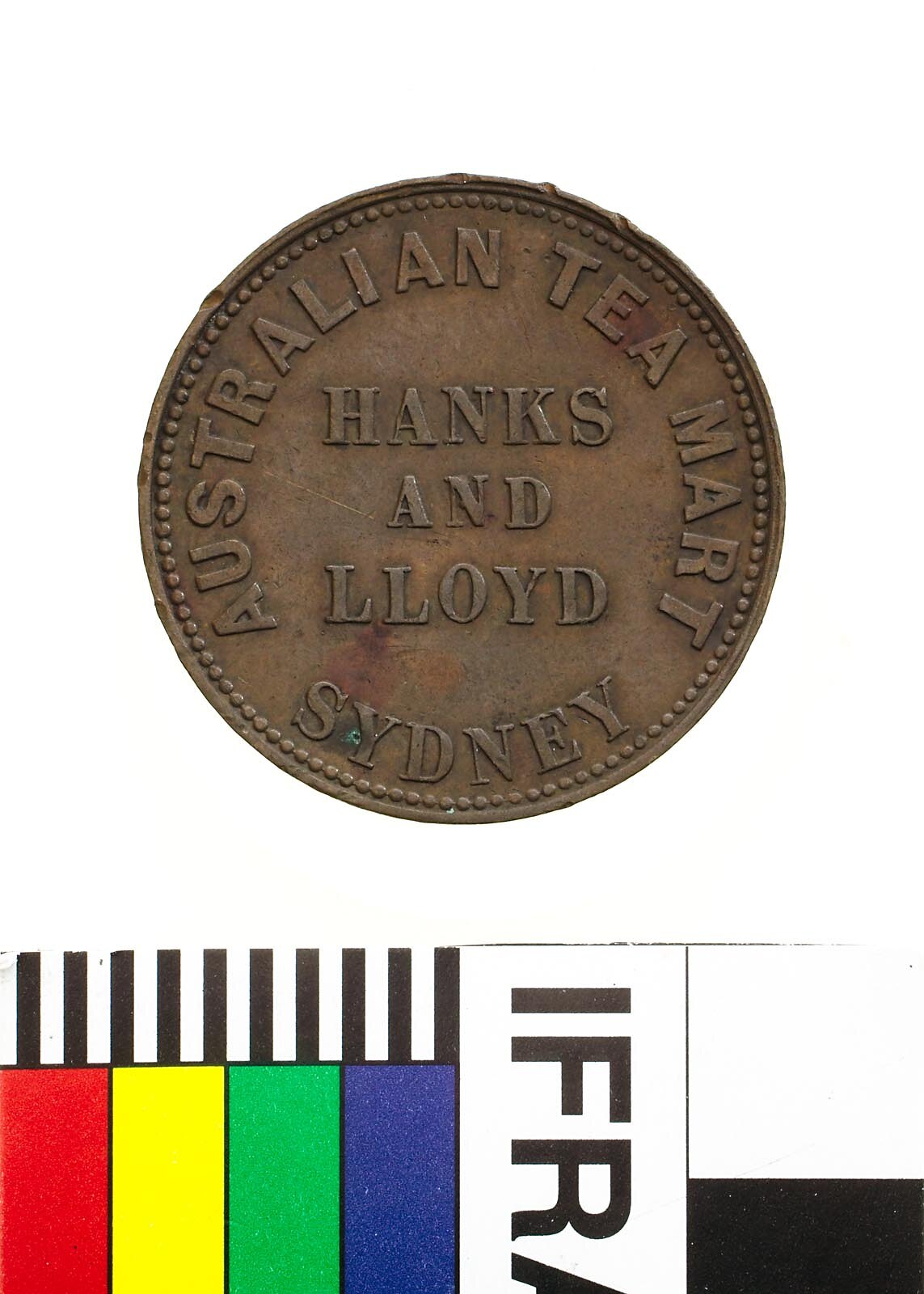 Obverse: HANKS AND LLOYD AUSTRALIAN TEA MART SYDNEY Reverse: PEACE & PLENTY 1857