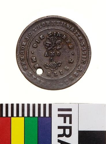 Copper Halfpenny Token, minted and issued by J.C. Thornthwaite of New South Wales, in 1854. Thornthwaite was the first person to manufacture tokens and medals in Australia. Migrating to Sydney in 1849, his tokens are noteworthy for the lack of clarity of detail in design because the dies were not cut deep enough and he lacked the tools to produce high quality tokens. Thornthwaite also worked as a medallist, particularly after tokens were made illegal in NSW in 1868.
