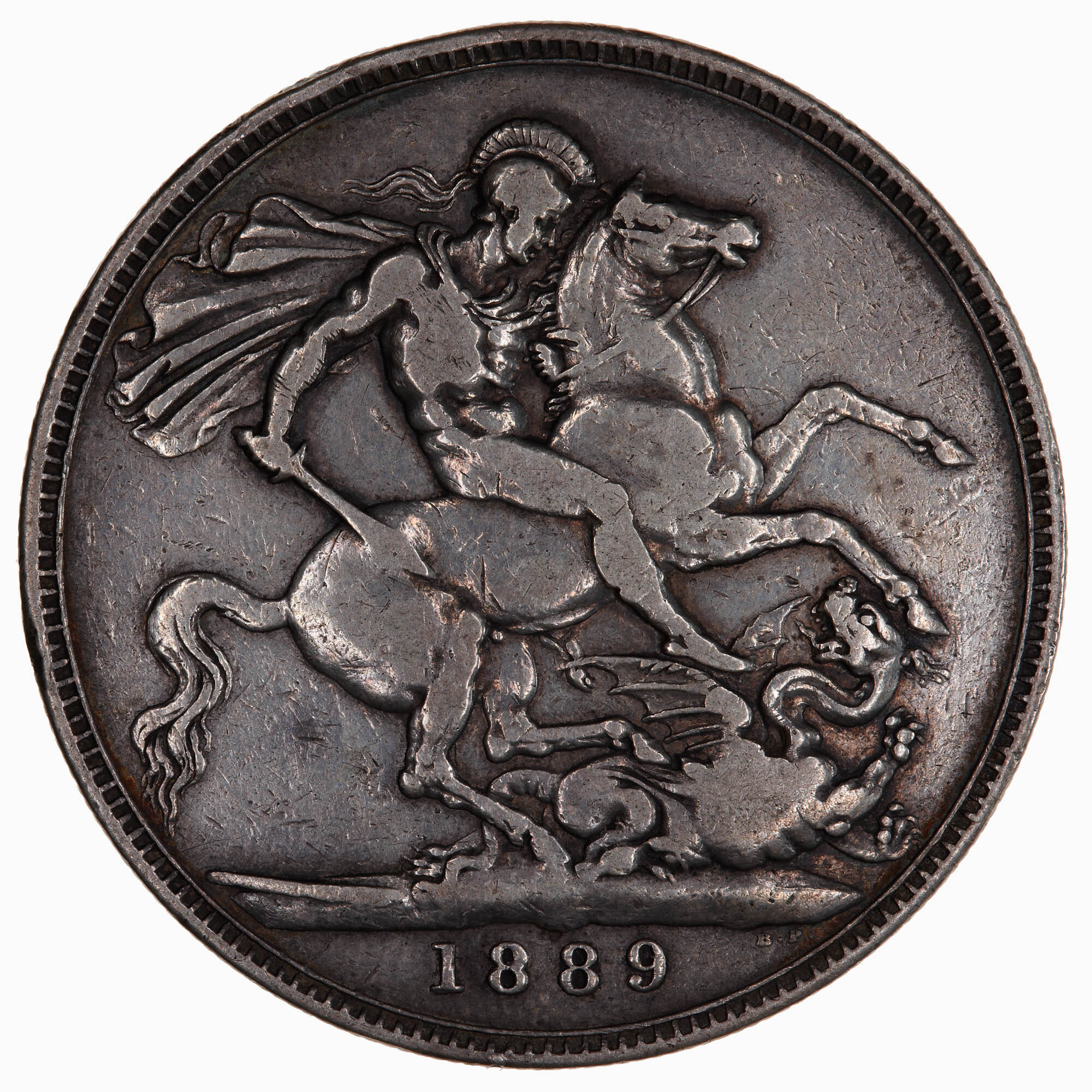 A crown is a 5 shillings coin. Struck as part of a new coinage to celebrait the Golden Jubilee of Queen Victoria, 1837-1887. The coins all shared a new obverse of the Queen, adapted from Boehm's own Jubillee medal. It proved unpopular and was replaced in 1893.