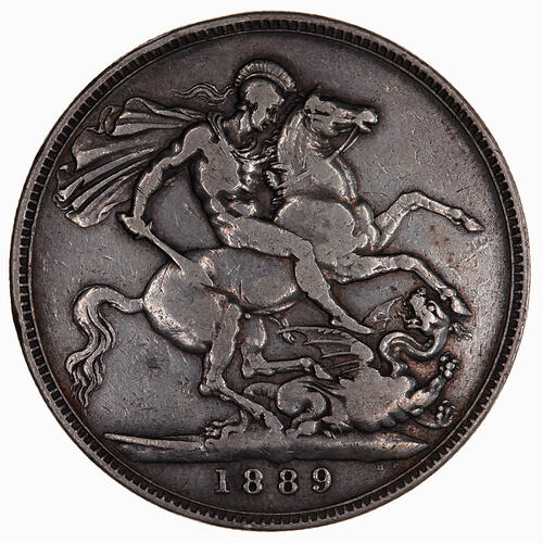St George on horseback advancing to right wearing a helmet and cape and holding a sword; below horse, fallen dragon with lance in its side; below exergue line at right the artist's initials B.P. (Benedetto Pistrucci); in exergue, 1889