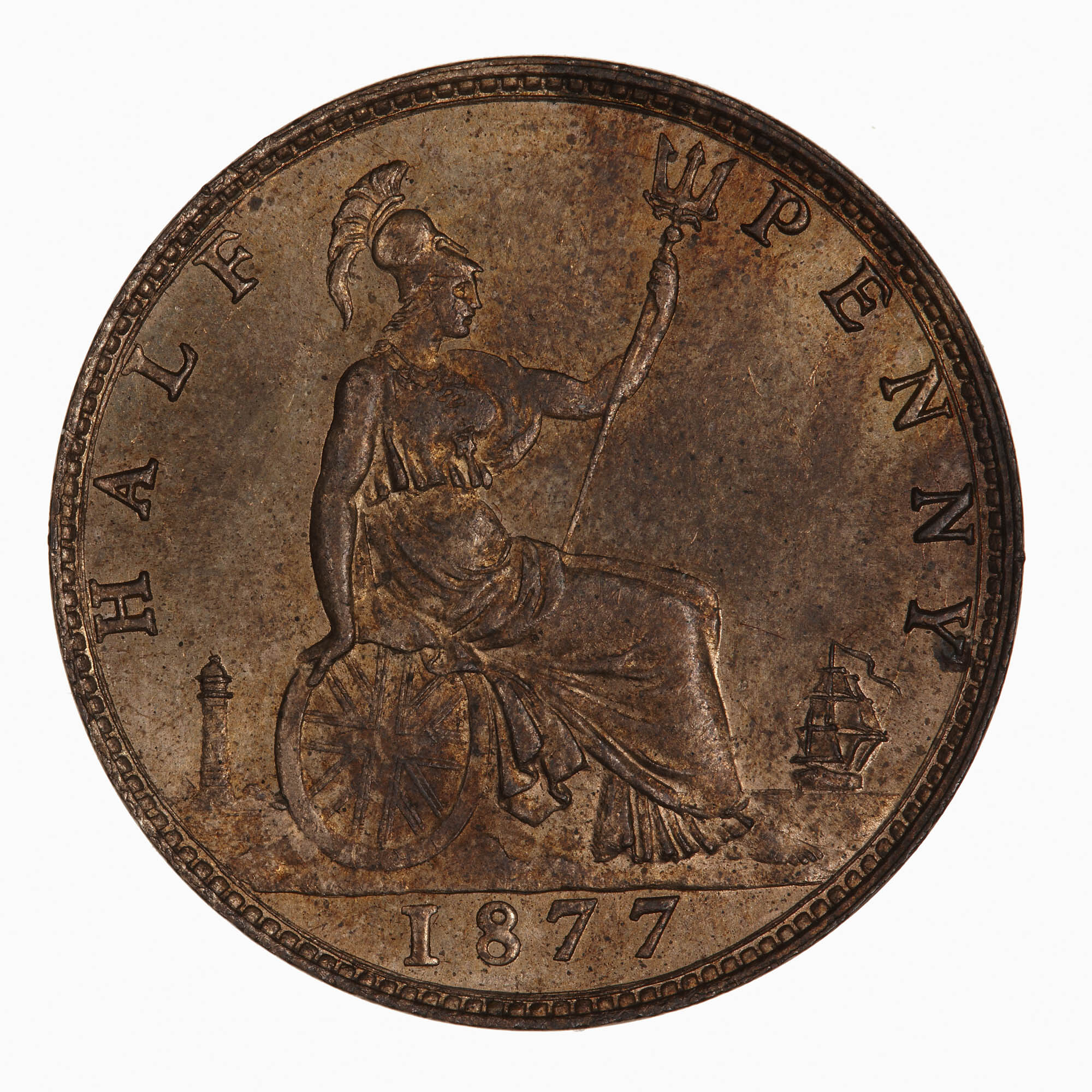 Britannia seated facing right on a rock wearing a helmet and breastplate with flowing dress; she holds a trident and rests her right hand on a shield which bears the combined crosses of the Union Flag; at right a ship sailing away; at left, a lighthouse; around, HALF PENNY; in exergue, 1877
