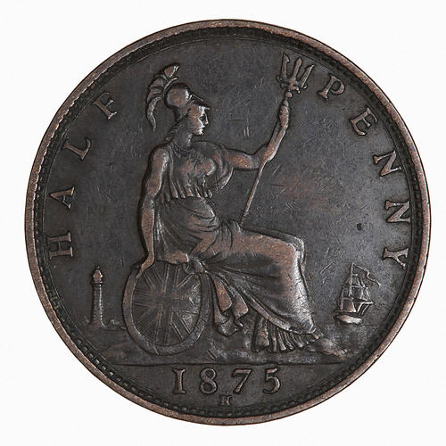 Britannia seated facing right on a rock wearing a helmet and breastplate with flowing dress; she holds a trident and rests her right hand on a shield which bears the combined crosses of the Union Flag; at right a ship sailing away; at left, a lighthouse; around, HALF PENNY; in exergue, 1875; below date, H