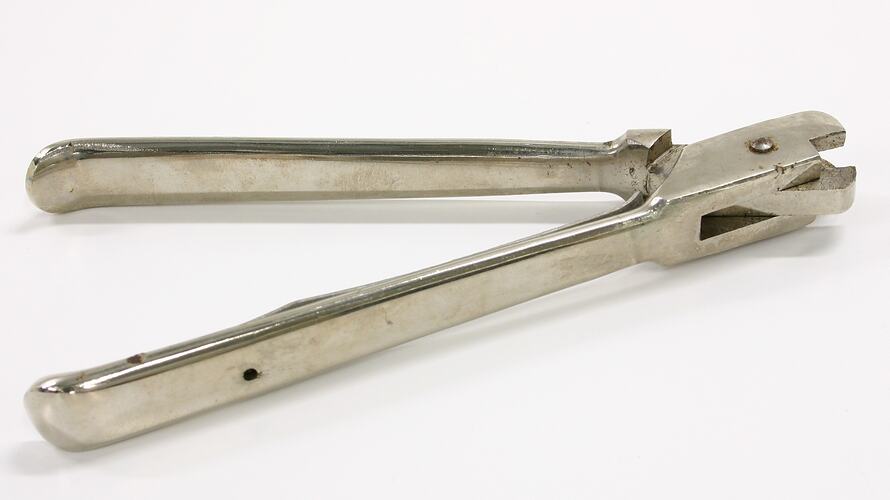 A metal tool - two arms joined at the very top to give a scissor-effect when operating. It has flattened, slimline handles; handle tips curl inward. A long clip is screwed to the inner side of one handle. The heads of the arms are more solidly shaped; the two sides interlock - one side is forked the other sits inside the gap between the two prongs.