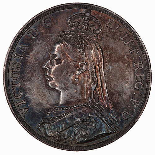 A crown is a 5 shillings coin. Struck as part of a new coinage to celebrait the Golden Jubilee of Queen Victoria, 1837-1887. The coins all shared a new obverse of the Queen, adapted from Boehm's own Jubillee medal. It proved unpopular and was replaced in 1893.