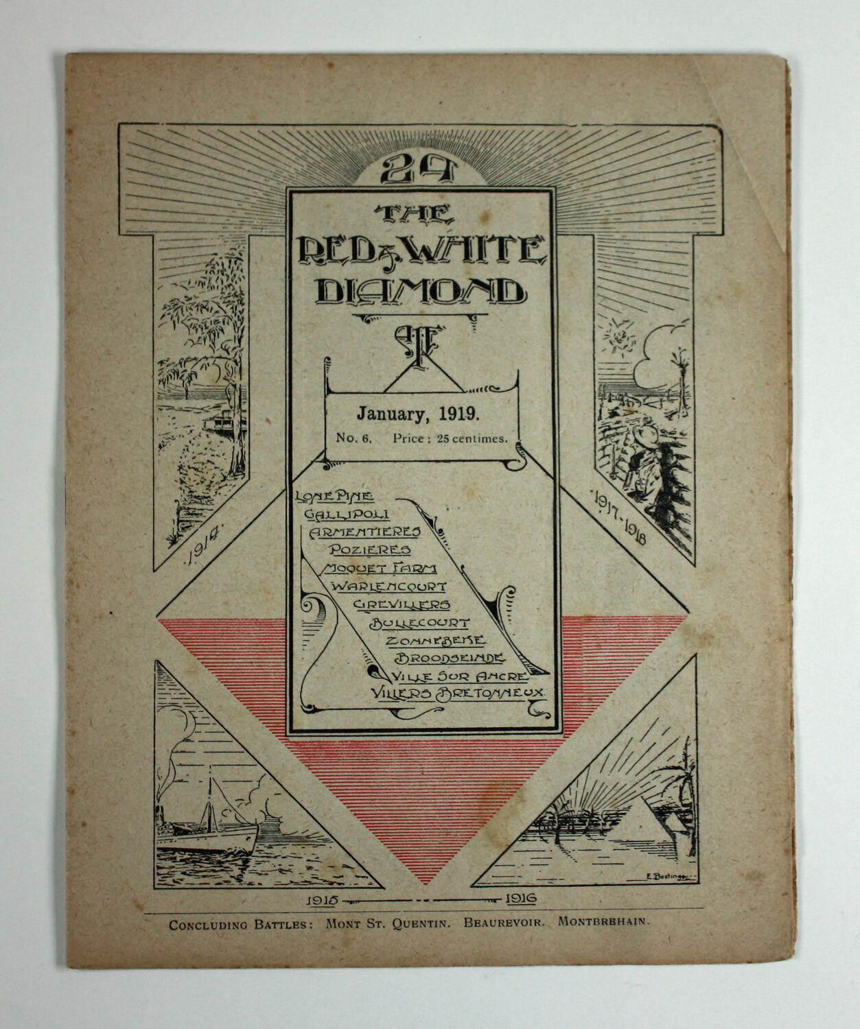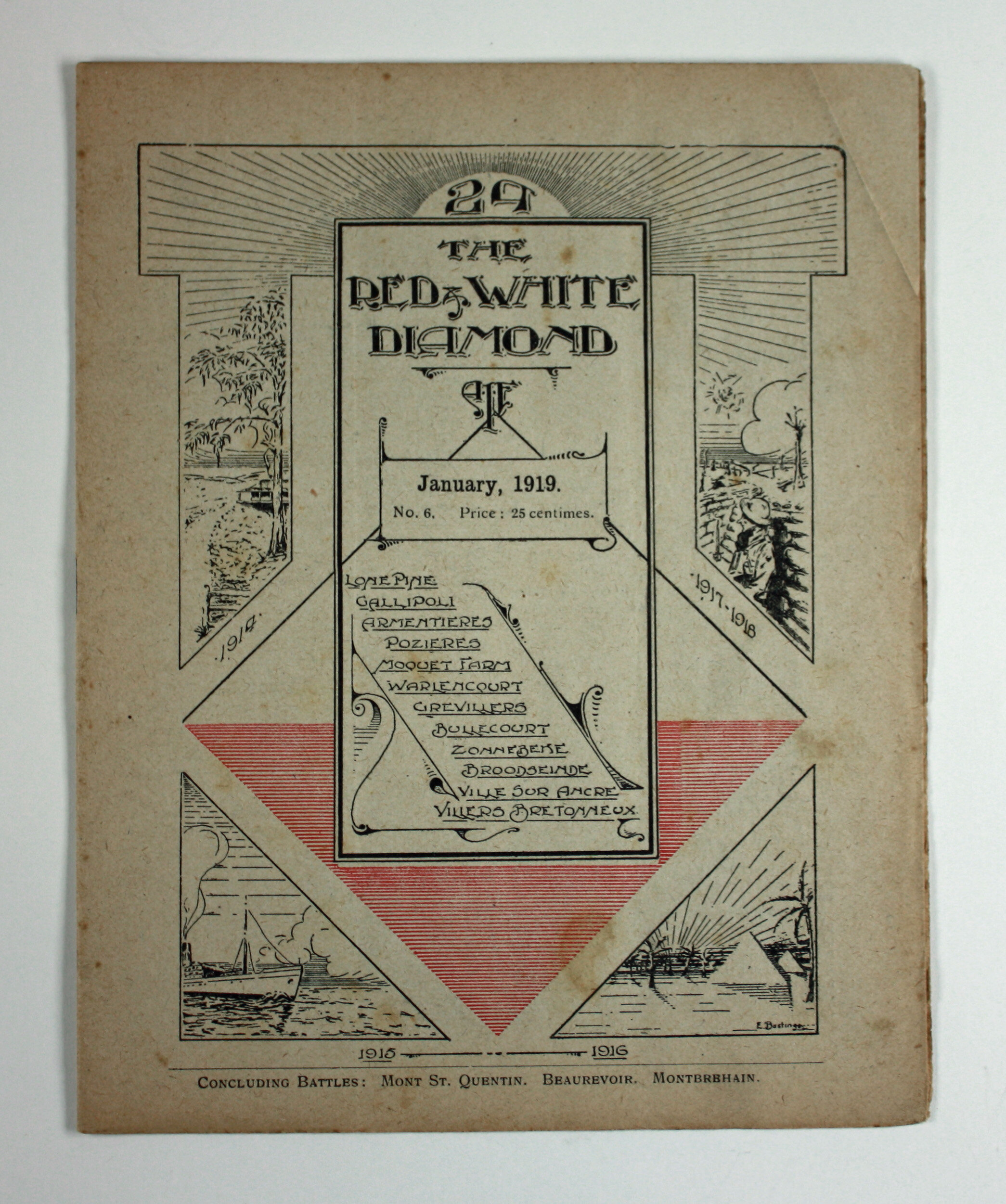 On cover: 24/ THE/ RED & WHITE/ DIAMOND/ AIF/ January, 1919./ No. 6, Price: 25 Centimes/ LONE PINE/ GALLIPOLI/ ARMENTIERES/ POZIERES/ MOQUET FARM/ WARLENCOURT/GREVILLERS/ BULLECOURT/ ZONNEBENE/ BROODSEINDE/ VILLE SUR ANCRE/ VILLERS BRETONNEUX./ CONCLUDING GATTLES: MONT ST. QUENTIN. BEAUREVOIR, MONTBREHAIN.