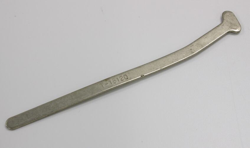 A metal tool. It is a flattened bar, angled towards the base, and it has a moulded tip. The tip has two circular knobs on one side.