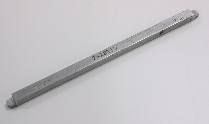 A metal rod with a square cross-section. Half of the tip of each end - cut 5mm deep - has been removed. The rod is stamped with the tool number. The number '190' stamped at left end; the number '210' is stamped at the other.