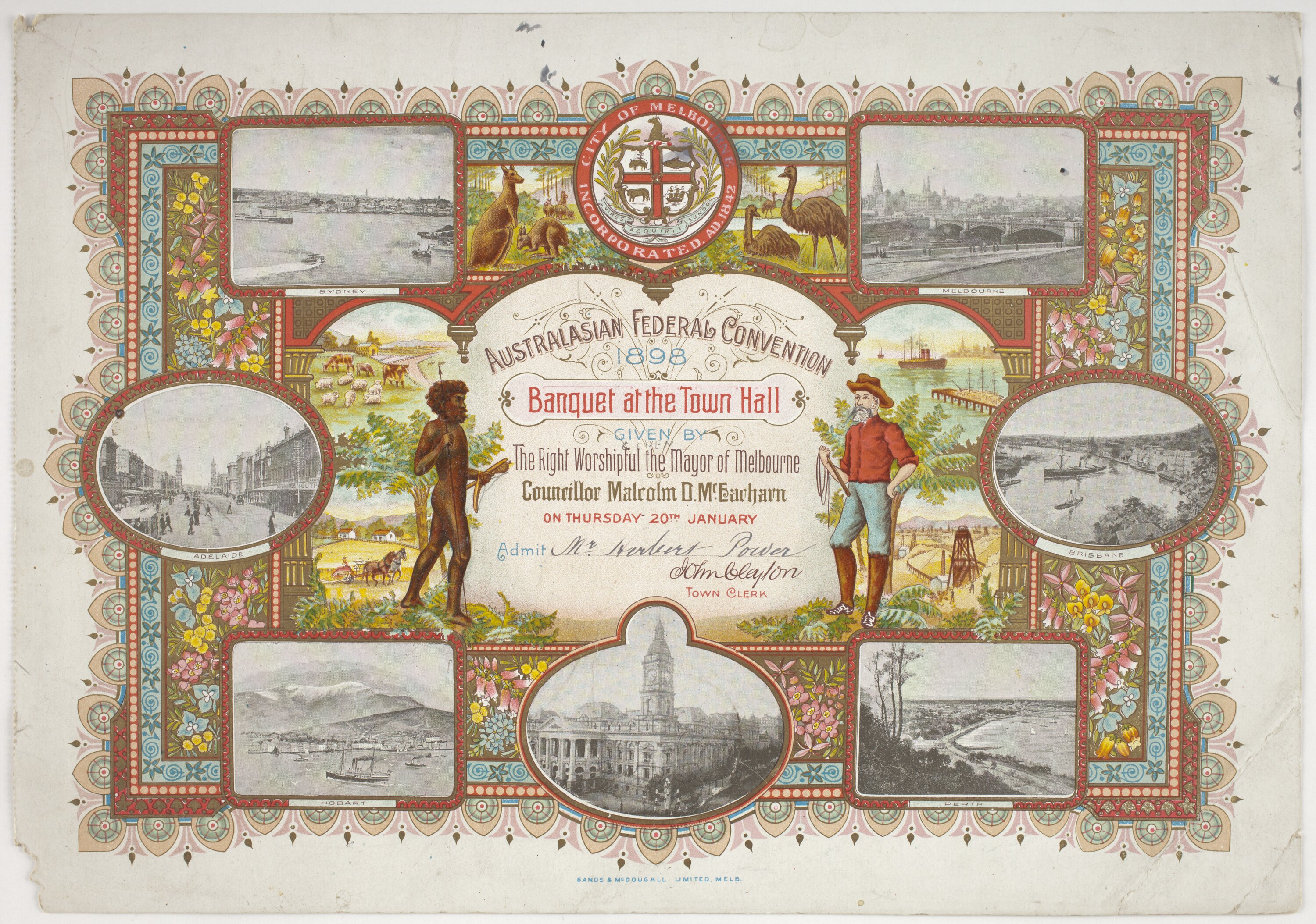 Decorative invitation to the Australasian Federal Convention Banquet to be held on 20 January 1898 at the Melbourne Town Hall. It was issued to Mr Herbert Power and was printed by Sands & McDougall Ltd, Melbourne. The Australasian Federal Convention met, in three sessions, in Adelaide Sydney and Melbourne in 1897 and early 1898, to modify the draft constitution produced at the National Australasian Convention of 1891 which met in Sydney from 2 March to 9 April 1891.