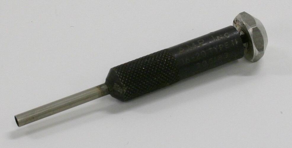 Tape Punch has a slim metal tube connected to a wider black metal tube, this is capped by a hexagonal nut. Bottom part of black tube has a textured finish.