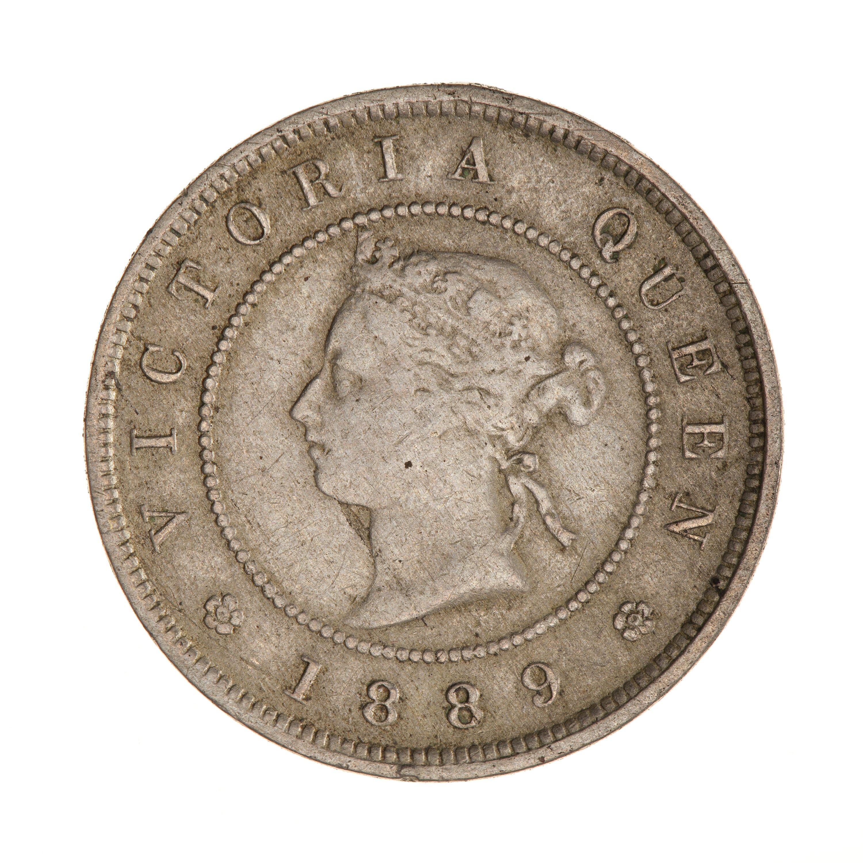 Within a beaded circle, a diademed head of the Queen facing left; around, VICTORIA QUEEN; below between two roses, 1889